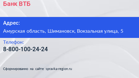 Банк ВТБ по адресу Амурская область, Шимановск, Вокзальная улица, 5 в дальнейшем Организация, размещена в следующих категориях: