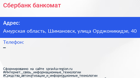Сбербанк, банкомат по адресу Амурская область, Шимановск, улица Орджоникидзе, 40 в дальнейшем Организация, размещена в следующих категориях: