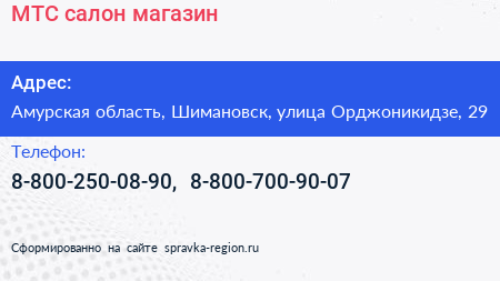 МТС, салон-магазин по адресу Амурская область, Шимановск, улица Орджоникидзе, 29 в дальнейшем Организация, размещена в следующих категориях: