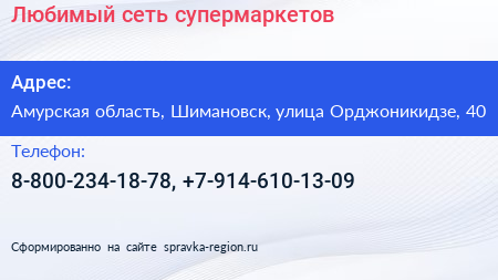 Любимый, сеть супермаркетов по адресу Амурская область, Шимановск, улица Орджоникидзе, 40 в дальнейшем Организация, размещена в следующих категориях: