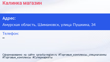 Калинка, магазин по адресу Амурская область, Шимановск, улица Пушкина, 34 в дальнейшем Организация, размещена в следующих категориях: