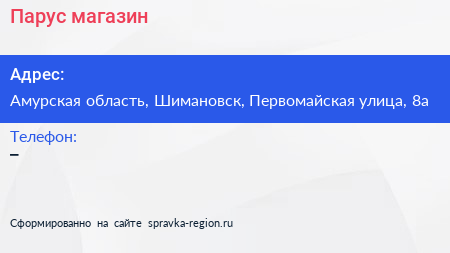 Парус, магазин по адресу Амурская область, Шимановск, Первомайская улица, 8а в дальнейшем Организация, размещена в следующих категориях: