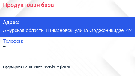 Продуктовая база по адресу Амурская область, Шимановск, улица Орджоникидзе, 49 в дальнейшем Организация, размещена в следующих категориях: