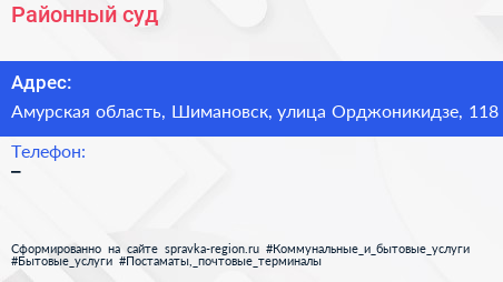 Районный суд по адресу Амурская область, Шимановск, улица Орджоникидзе, 118 в дальнейшем Организация, размещена в следующих категориях: