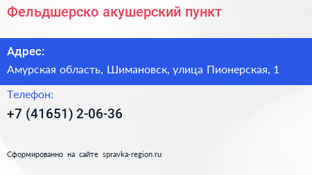 Фельдшерско-акушерский пункт по адресу Амурская область, Шимановск, улица Пионерская, 1 в дальнейшем Организация, размещена в следующих категориях: