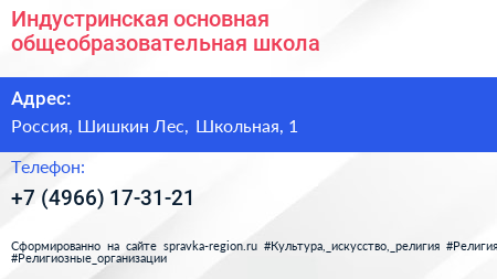 Индустринская основная общеобразовательная школа по адресу Индустринская общеобразовательная школа, Центральная улица, Индустрия, городской округ Коломна, Московская область, Центральный федеральный округ, 140474, Россия в дальнейшем Организация, размещена в следующих категориях: