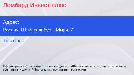 Ломбард Инвест плюс по адресу ТРК Морозовский, 7, улица Мира, посёлок имени Морозова, Морозовское городское поселение, Всеволожский район, Ленинградская область, Северо-Западный федеральный округ, 188679, Россия в дальнейшем Организация, размещена в следующих категориях: