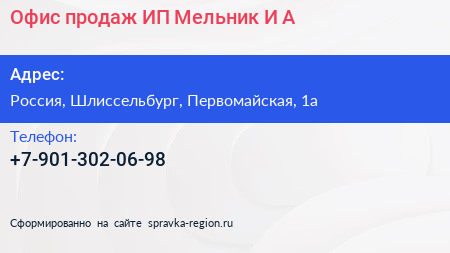 Офис продаж, ИП Мельник И.А. по адресу 1, Первомайская улица, посёлок имени Морозова, Морозовское городское поселение, Всеволожский район, Ленинградская область, Северо-Западный федеральный округ, 188679, Россия в дальнейшем Организация, размещена в следующих категориях: