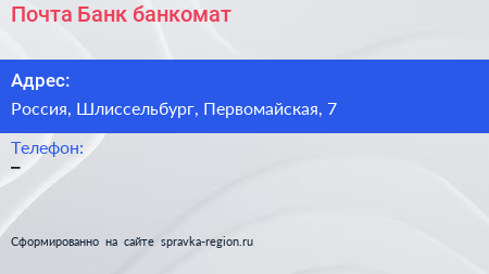 Почта Банк, банкомат по адресу 7, Первомайская улица, посёлок имени Морозова, Морозовское городское поселение, Всеволожский район, Ленинградская область, Северо-Западный федеральный округ, 188679, Россия в дальнейшем Организация, размещена в следующих категориях: