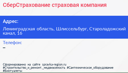 СберСтрахование, страховая компания по адресу Ленинградская область, Шлиссельбург, Староладожский канал, 16 в дальнейшем Организация, размещена в следующих категориях: