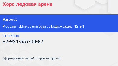Хорс, ледовая арена по адресу Ледовая арена Хорс, 42, Ладожская улица, посёлок имени Морозова, Морозовское городское поселение, Всеволожский район, Ленинградская область, Северо-Западный федеральный округ, 188679, Россия в дальнейшем Организация, размещена в следующих категориях: