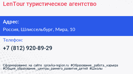 LenTour, туристическое агентство по адресу 10, улица Мира, посёлок имени Морозова, Морозовское городское поселение, Всеволожский район, Ленинградская область, Северо-Западный федеральный округ, 188679, Россия в дальнейшем Организация, размещена в следующих категориях: