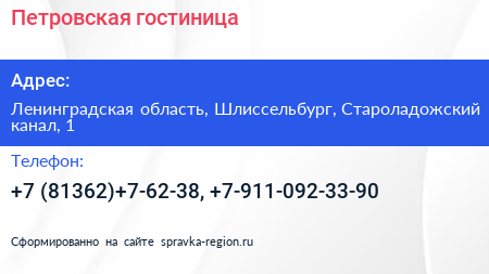 Петровская, гостиница по адресу Ленинградская область, Шлиссельбург, Староладожский канал, 1 в дальнейшем Организация, размещена в следующих категориях: