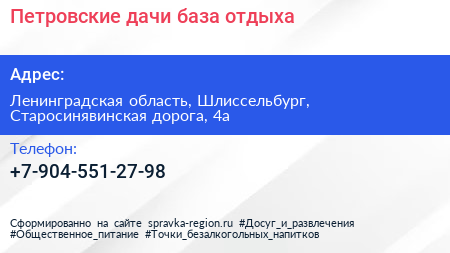 Петровские дачи, база отдыха по адресу Ленинградская область, Шлиссельбург, Старосинявинская дорога, 4а в дальнейшем Организация, размещена в следующих категориях: