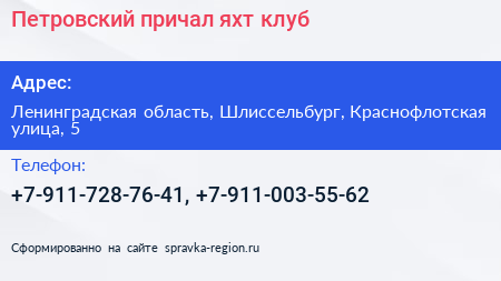 Петровский причал, яхт-клуб по адресу Ленинградская область, Шлиссельбург, Краснофлотская улица, 5 в дальнейшем Организация, размещена в следующих категориях: