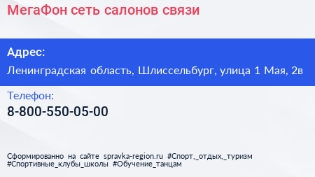 МегаФон, сеть салонов связи по адресу Ленинградская область, Шлиссельбург, улица 1 Мая, 2в в дальнейшем Организация, размещена в следующих категориях: