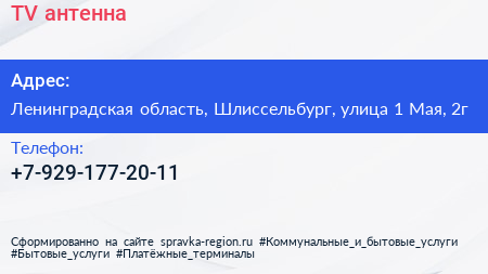 TV- антенна по адресу Ленинградская область, Шлиссельбург, улица 1 Мая, 2г в дальнейшем Организация, размещена в следующих категориях: