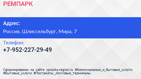 РЕМПАРК по адресу ТРК Морозовский, 7, улица Мира, посёлок имени Морозова, Морозовское городское поселение, Всеволожский район, Ленинградская область, Северо-Западный федеральный округ, 188679, Россия в дальнейшем Организация, размещена в следующих категориях: