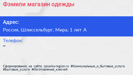 Фэмили, магазин одежды по адресу 1А, улица Мира, посёлок имени Морозова, Морозовское городское поселение, Всеволожский район, Ленинградская область, Северо-Западный федеральный округ, 188679, Россия в дальнейшем Организация, размещена в следующих категориях: