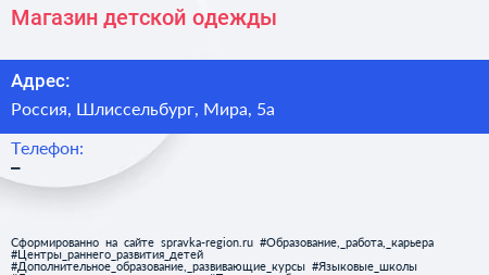 Магазин детской одежды по адресу Самбариста, улица Мира, посёлок имени Морозова, Морозовское городское поселение, Всеволожский район, Ленинградская область, Северо-Западный федеральный округ, 188679, Россия в дальнейшем Организация, размещена в следующих категориях:
