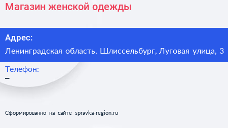 Магазин женской одежды по адресу Ленинградская область, Шлиссельбург, Луговая улица, 3 в дальнейшем Организация, размещена в следующих категориях: