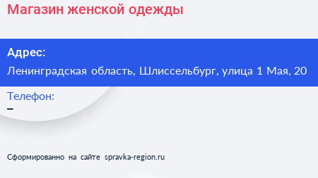 Магазин женской одежды по адресу Ленинградская область, Шлиссельбург, улица 1 Мая, 20 в дальнейшем Организация, размещена в следующих категориях: