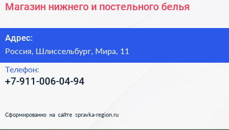 Магазин нижнего и постельного белья по адресу 11, улица Мира, посёлок имени Морозова, Морозовское городское поселение, Всеволожский район, Ленинградская область, Северо-Западный федеральный округ, 188679, Россия в дальнейшем Организация, размещена в следующих категориях: