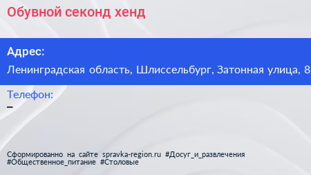 Обувной секонд-хенд по адресу Ленинградская область, Шлиссельбург, Затонная улица, 8 в дальнейшем Организация, размещена в следующих категориях:
