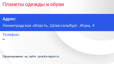 Планеты одежды и обуви по адресу Ленинградская область, Шлиссельбург, Жука, 4 в дальнейшем Организация, размещена в следующих категориях: