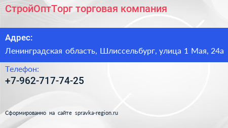 СтройОптТорг, торговая компания по адресу Ленинградская область, Шлиссельбург, улица 1 Мая, 24а в дальнейшем Организация, размещена в следующих категориях: