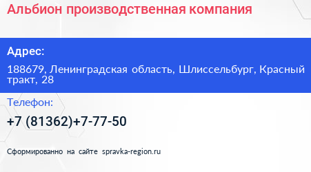 Альбион, производственная компания по адресу 188679, Ленинградская область, Шлиссельбург, Красный тракт, 28 в дальнейшем Организация, размещена в следующих категориях: