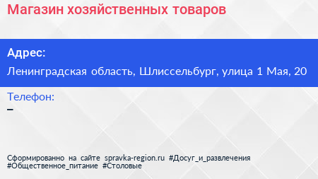 Магазин хозяйственных товаров по адресу Ленинградская область, Шлиссельбург, улица 1 Мая, 20 в дальнейшем Организация, размещена в следующих категориях: