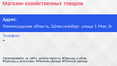 Магазин хозяйственных товаров по адресу Ленинградская область, Шлиссельбург, улица 1 Мая, 2г в дальнейшем Организация, размещена в следующих категориях: