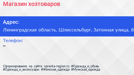 Магазин хозтоваров по адресу Ленинградская область, Шлиссельбург, Затонная улица, 8 в дальнейшем Организация, размещена в следующих категориях: