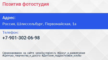 Позитив, фотостудия по адресу Первомайская улица, посёлок имени Морозова, Морозовское городское поселение, Всеволожский район, Ленинградская область, Северо-Западный федеральный округ, 188679, Россия в дальнейшем Организация, размещена в следующих категориях: