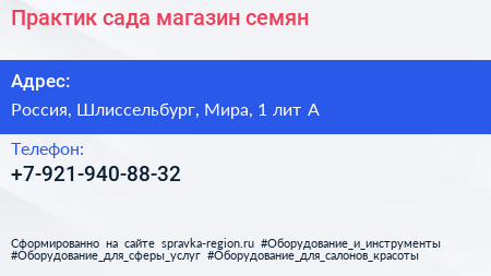 Практик сада, магазин семян по адресу 1А, улица Мира, посёлок имени Морозова, Морозовское городское поселение, Всеволожский район, Ленинградская область, Северо-Западный федеральный округ, 188679, Россия в дальнейшем Организация, размещена в следующих категориях: