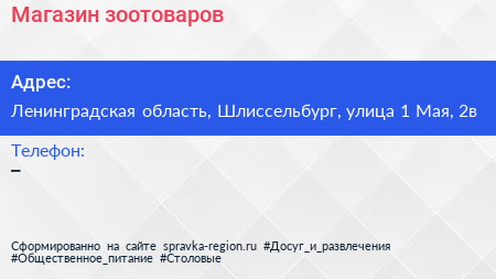 Магазин зоотоваров по адресу Ленинградская область, Шлиссельбург, улица 1 Мая, 2в в дальнейшем Организация, размещена в следующих категориях: