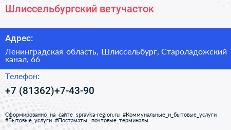 Шлиссельбургский ветучасток по адресу Ленинградская область, Шлиссельбург, Староладожский канал, 66 в дальнейшем Организация, размещена в следующих категориях: