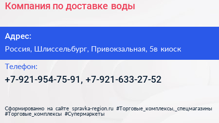 Компания по доставке воды по адресу 3, 41К-317, садоводческий массив "Дунай", Дунай, Морозовское городское поселение, Всеволожский район, Ленинградская область, Северо-Западный федеральный округ, 188679, Россия в дальнейшем Организация, размещена в следующих категориях: