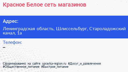 Красное & Белое, сеть магазинов по адресу Ленинградская область, Шлиссельбург, Староладожский канал, 1а в дальнейшем Организация, размещена в следующих категориях: