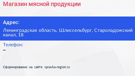 Магазин мясной продукции по адресу Ленинградская область, Шлиссельбург, Староладожский канал, 18 в дальнейшем Организация, размещена в следующих категориях: