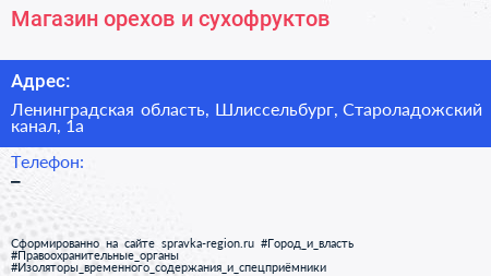 Магазин орехов и сухофруктов по адресу Ленинградская область, Шлиссельбург, Староладожский канал, 1а в дальнейшем Организация, размещена в следующих категориях:
