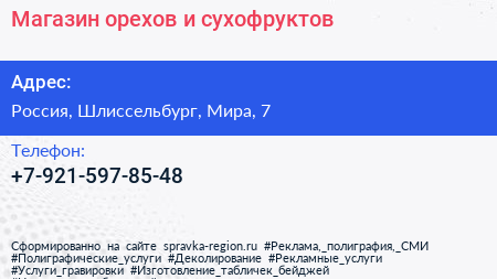 Магазин орехов и сухофруктов по адресу ТРК Морозовский, 7, улица Мира, посёлок имени Морозова, Морозовское городское поселение, Всеволожский район, Ленинградская область, Северо-Западный федеральный округ, 188679, Россия в дальнейшем Организация, размещена в следующих категориях: