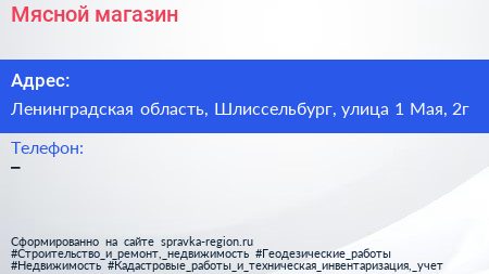 Мясной магазин по адресу Ленинградская область, Шлиссельбург, улица 1 Мая, 2г в дальнейшем Организация, размещена в следующих категориях: