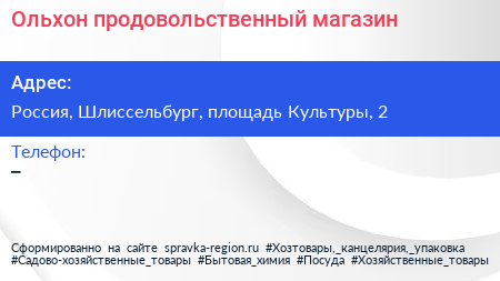 Ольхон, продовольственный магазин по адресу 2, площадь Культуры, посёлок имени Морозова, Морозовское городское поселение, Всеволожский район, Ленинградская область, Северо-Западный федеральный округ, 188679, Россия в дальнейшем Организация, размещена в следующих категориях: