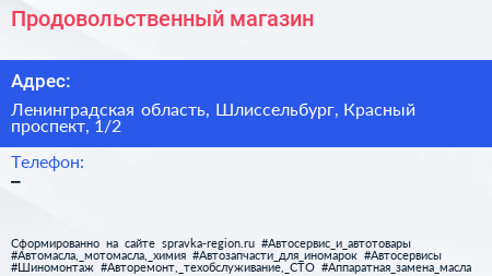 Продовольственный магазин по адресу Ленинградская область, Шлиссельбург, Красный проспект, 1/2 в дальнейшем Организация, размещена в следующих категориях:
