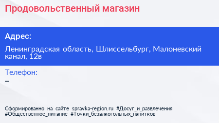 Продовольственный магазин по адресу Ленинградская область, Шлиссельбург, Малоневский канал, 12в в дальнейшем Организация, размещена в следующих категориях: