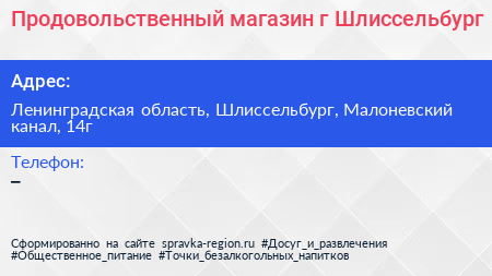 Продовольственный магазин, г. Шлиссельбург по адресу Ленинградская область, Шлиссельбург, Малоневский канал, 14г в дальнейшем Организация, размещена в следующих категориях: