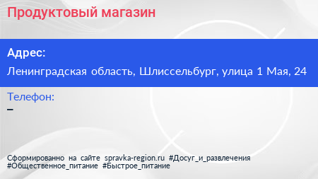 Продуктовый магазин по адресу Ленинградская область, Шлиссельбург, улица 1 Мая, 24 в дальнейшем Организация, размещена в следующих категориях: