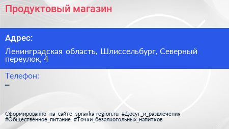 Продуктовый магазин по адресу Ленинградская область, Шлиссельбург, Северный переулок, 4 в дальнейшем Организация, размещена в следующих категориях: